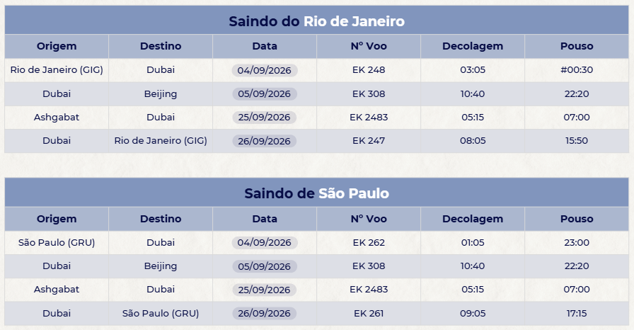 Apresentação no Aeroporto Internacional do Galeão, no Rio de Janeiro, ou no Aeroporto Internacional de Guarulhos, em São Paulo, para procedimentos de embarque no voo internacional da Emirates na madrugada do dia seguinte.